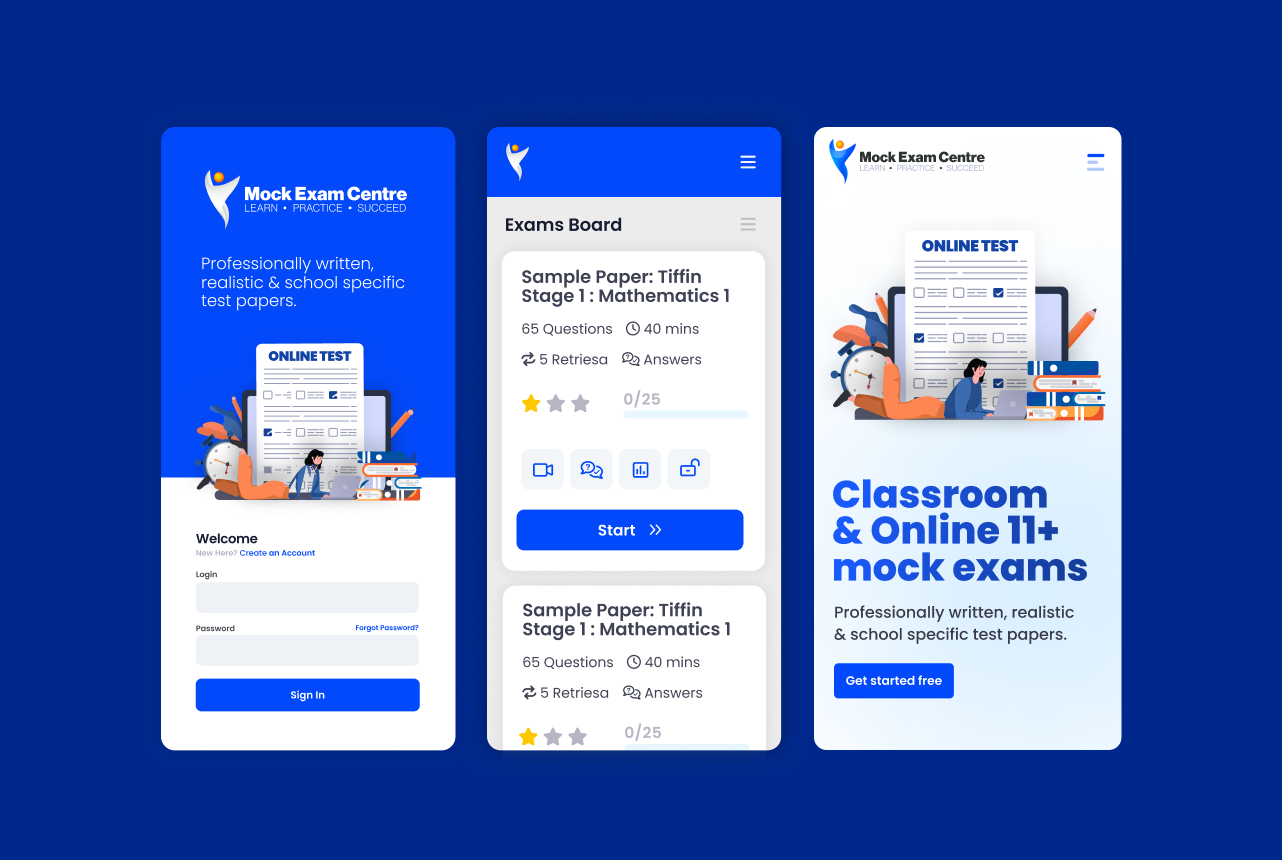 The goal was to create a web-based mock exam platform for Grammar and Independent school entrance exams such as GL Assessment, CEM, CSSE, Tiffin/SET, ISEB. The client requested that these online mock tests closely resemble the actual paper exams in terms of style, standards, and layout. The mock exam platform works as a comprehensive resource for revision and learning, providing students with handwritten and video solutions to enhance their comprehension of school exams. Furthermore, the system incorporates a user-friendly dashboard equipped with a comparison tool and statistical data analysis capabilities, enabling students to monitor their progress and gain valuable insights into their performance. Students have opportunities for online practice, skill refinement, and performance enhancement in preparation for their final exams.
